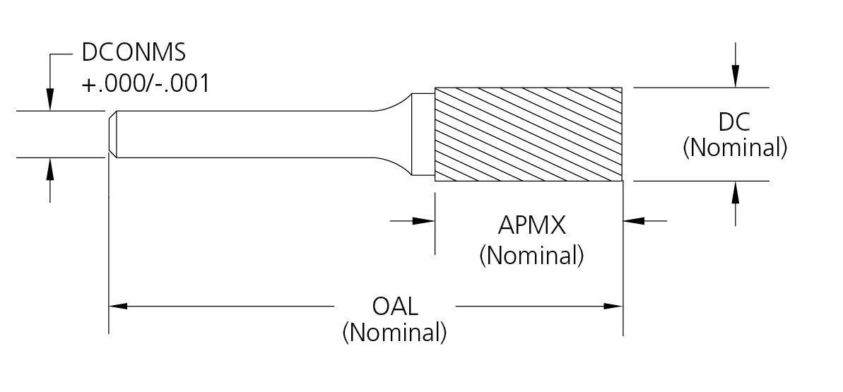 • Solid carbide 1/4" sizes and below, brazed construction over 1/4"