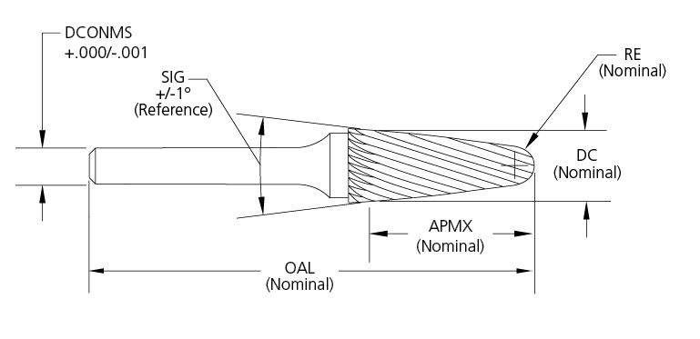 • Solid carbide 1/4" sizes and below, brazed construction over 1/4"