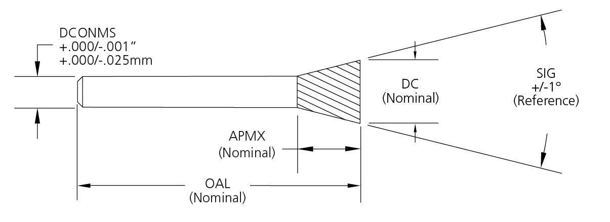 • Solid carbide 1/4" sizes and below, brazed construction over 1/4"