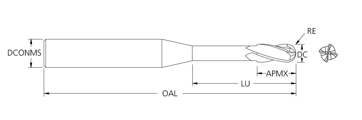 Solid Carbide TuffCut® GX 4 Flute End Mill Ball Nose Gem X Coated. Excellent for high performance milling of graphite and similar materials. Designed for milling fillets or similar rounded corners in the bottom of a cut.