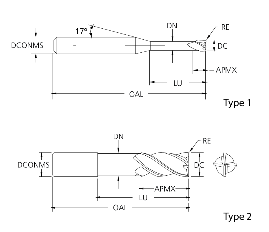 Tool No. EDP Diameter (DC) Shank Diameter (DCONMS) Neck Diameter (DN) Overall Length (OAL) Flute Length (APMX) Neck Length (LU) RE Coating Shank Type Available List Price