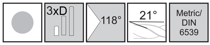Shorter overhang reduces deflection and vibration and increases drill accuracy and improves tool life. Allows high feed rates with good chip flow. Four facet drill point minimizes drill wander and assures accurately sized holes. For Inch size stub drills, see Series 206.