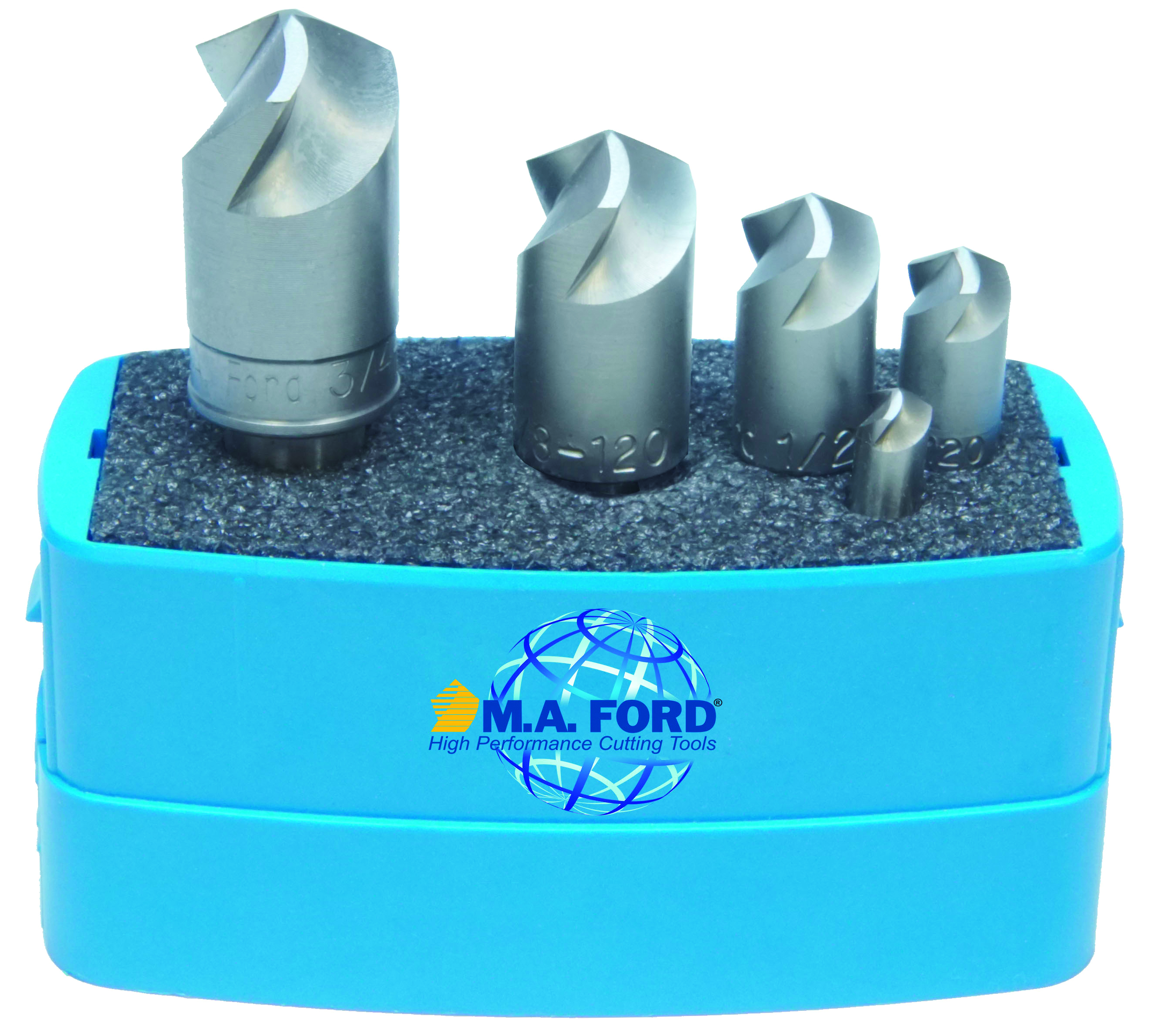 Standard 3 Flute countersinks are designed for economical, general purpose countersinking, chamfering or deburring in Aluminum, Brass and similar materials. Bright finish helps reduce chip build-up on the cutting edge. Spiral flute geometry for a clean, chatterless finish. 5 piece set includes 1/4", 3/8", 1/2", 5/8", and 3/4" diameters.